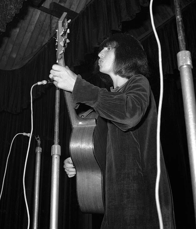 Australian folk-singer, Margaret Kitamura, playing the guitar she loaned to Bob Dylan for the Australian tour.